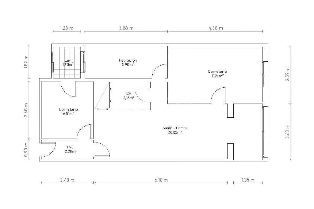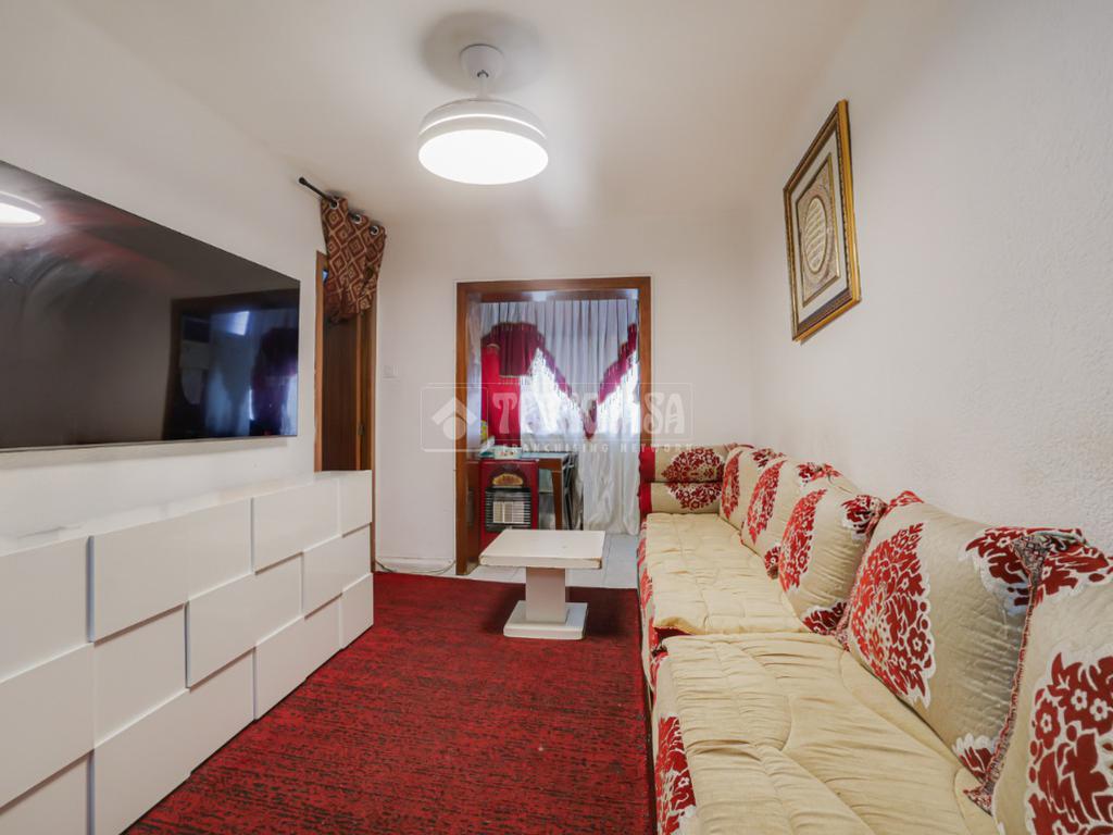 Piso de 56 m2 de vivienda. Consta de un salón contiguo a la cocina, comedor, 3 habitaciones (1 doble y 2 individuales), cuarto de baño con bañera.